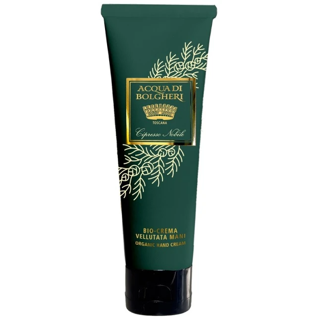 Acqua Di Bolgheri Toscana Cipresso Nobile Bio Crema Vellutata Mani 75 ml, è una crema mani biologica, nutriente e delicatamente profumata, arricchita con estratti di cipresso nobile toscano per mani morbide e vellutate.