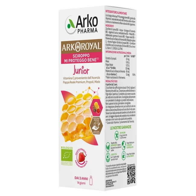 - ARKOROYAL SCIROPPO MI PROTEGGO BENE Junior Descrizione Integratore alimentare. La vitamina C naturale derivante dall’acerola, aiuta a ridurre la fatica e a mantenere le difese naturali dell’organismo. Ingredienti Zucchero di canna bio, acqua, sciroppo di frumento bio; agente di carica: maltodestrine bio; miele bio; addensante: gomma di acacia bio; pappa reale bio, polvere di succo di bacca di acerola bio (Malpighia glabra L.), aroma fragola, estratto di propoli bio; acidificante: succo concentrato di limone bio [Citrus limon (L.) Burm. f.]. Senza glutine. Caratteristiche nutrizionali Contenuti mediper 10 ml%VNR* Estratto di propoli33 mg Miele0,65 g Pappa reale di cui 10-HDA0,25 g 3,5 mg Polvere di succo di bacca da acerola di cui vitamina C85 mg 12 mg 15% *VNR: Valori Nutritivi di Riferimento Modalità d'uso A partire dai 3 anni. 2 cucchiaini da caffè al giorno (ossia 10 ml). Agitare il flacone prima dell’uso. Il prodotto può essere assunto più volte nel corso dell’anno. Avvertenze Non superare la dose giornaliera consigliata. Tenere fuori dalla portata dei bambini al di sotto dei 3 anni di età. Gli integratori alimentari non vanno intesi come sostituti di una dieta variata ed equilibrata e di uno stile di vita sano. Sconsigliato alle persone con antecedenti di allergie ai prodotti dell'alveare. Un leggero deposito del prodotto è da considerarsi normale e non nuoce alla qualità del prodotto. Conservazione Conservare preferibilmente in frigo dopo l'apertura. Validità a confezionamento integro: 24 mesi. Formato Flacone da 140 ml. Cod. 91040190