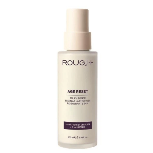 Rougj Age Reset Milky Toner si presenta come essenza lattiginosa rigenerante, con fattori di crescita e 7 ialuronici, pensato per unire l’efficacia riequilibrante di un tonico tradizionale al comfort di un trattamento idratante leggero. La sua formula è studiata per offrire idratazione profonda e sostegno alla pelle, contribuendo a migliorarne elasticità e morbidezza. Grazie alla presenza di attivi ad azione idratante e rimpolpante, il viso appare progressivamente più disteso, levigato e luminoso. La texture “milky” lo rende particolarmente confortevole anche per le pelli più secche o sensibili, evitando la sensazione di pelle che tira tipica di alcuni tonici a base alcolica. Non unge e si assorbe rapidamente, lasciando la pelle fresca ma nutrita. Con l’utilizzo costante, la pelle risulta più compatta, idratata e pronta a ricevere i trattamenti anti-age della stessa linea.