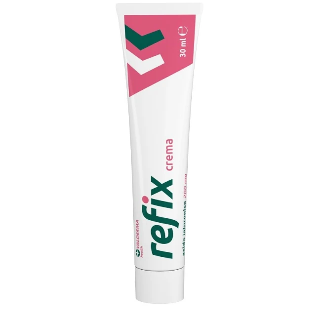 Crema dermatologica a base di acido ialuronico. Grazie al controllo del microambiente e dell'idratazione della cute, Refix crema favorisce i fisiologici processi di riparazione tissutale.