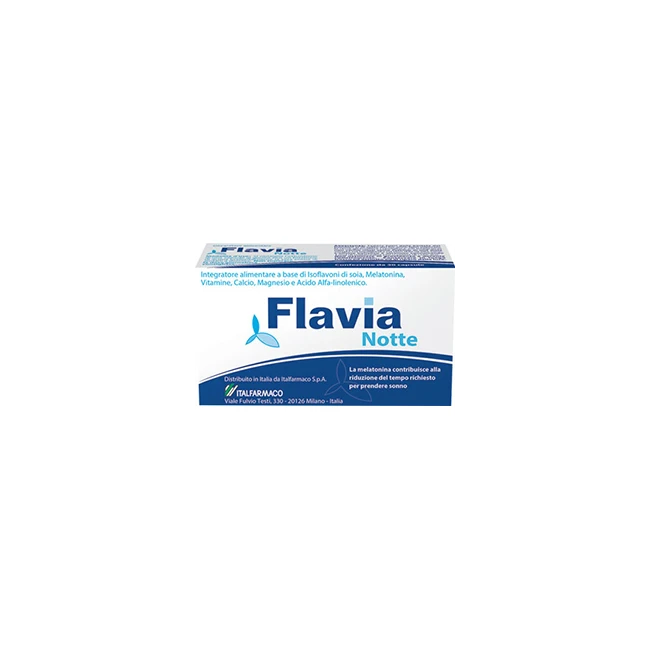 Integratore alimentare che combina estratto di soia (titolato al 40% in isoflavoni di soia), melatonina, vitamine (acido folico, vitamina D, vitamine B6 e B12), minerali (calcio, magnesio) e acido alfa-linolenico. Flavia Notte aiuta a soddisfare le esigenze nutrizionali della donna in menopausa.
