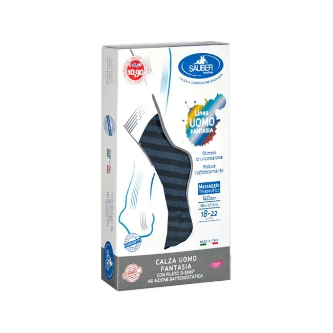 Calze uomo fantasia a compressione graduata in filato Q-SKIN, ad azione batteriostatica per facilitare la traspirazione della pelle e ridurre la sudorazione del piede. Possono essere abbinate sia ad un look classico ed elegante, sia ad un abbigliamento casual e giovanile. Ideali per essere indossate in qualunque occasione, dal lavoro al tempo libero, fino all’occasione speciale. Realizzate con polsino morbido che non stringe, e con punta e tallone in tinta unita.