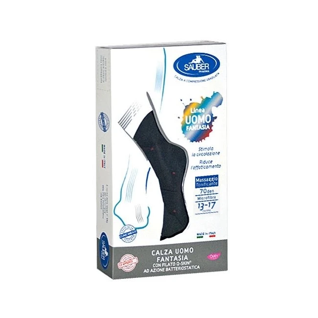 Calze uomo fantasia a compressione graduata in filato Q-SKIN, ad azione batteriostatica per facilitare la traspirazione della pelle e ridurre la sudorazione del piede. Possono essere abbinate sia ad un look classico ed elegante, sia ad un abbigliamento casual e giovanile. Ideali per essere indossate in qualunque occasione, dal lavoro al tempo libero, fino all’occasione speciale. Realizzate con polsino morbido che non stringe, e con punta e tallone in tinta unita.